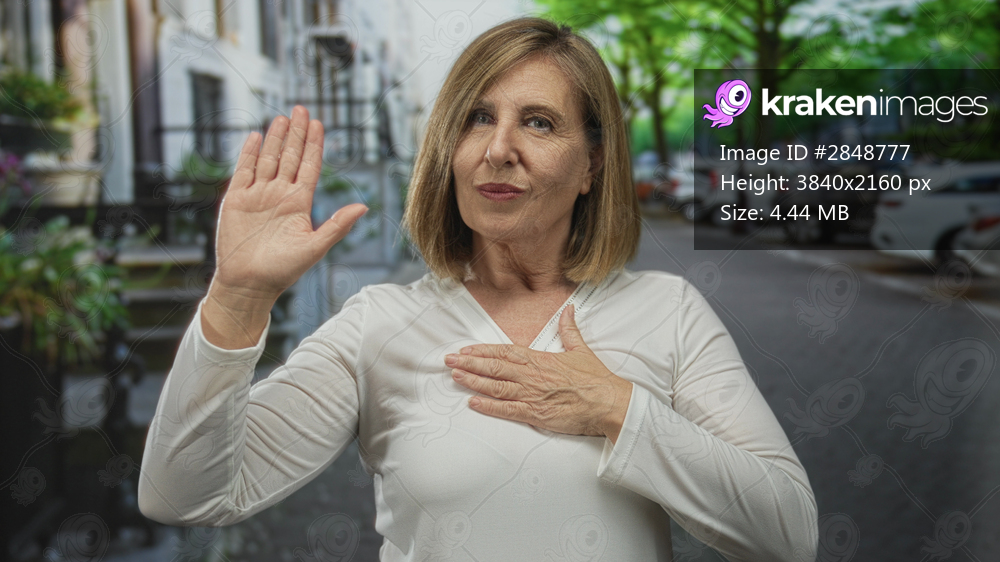 Middle aged caucasian woman in white top raises right hand and places left palm on chest in city street; sincerity.