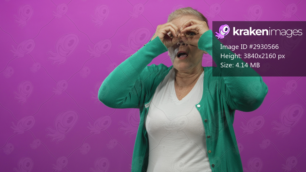 Middle aged caucasian woman making hand binoculars with hands over eyes in a purple studio wearing green cardigan and white tee; curiosity exploration. - Kraken Images