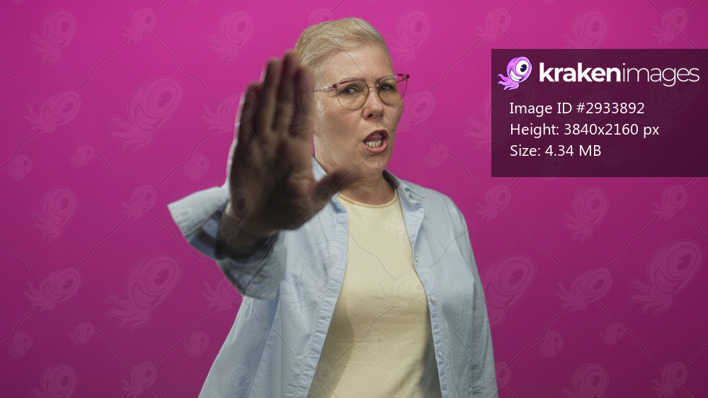 Middle aged caucasian woman with outstretched hand showing palm to stop in pink studio; defiance personal boundary.