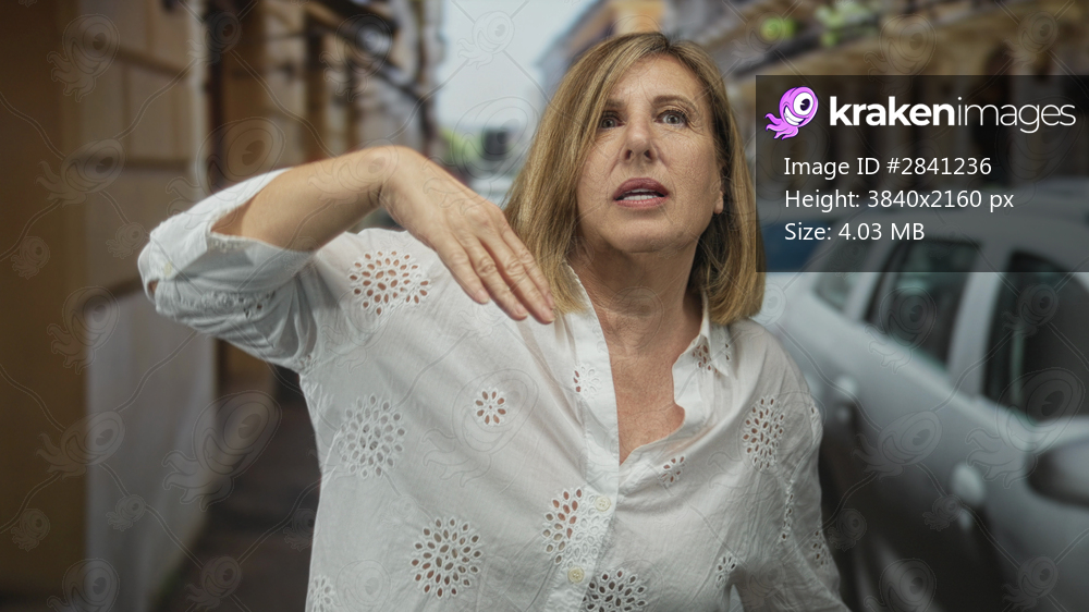 Middle aged caucasian woman shielding her eyes with raised hands on a busy urban street with parked cars; frustration.