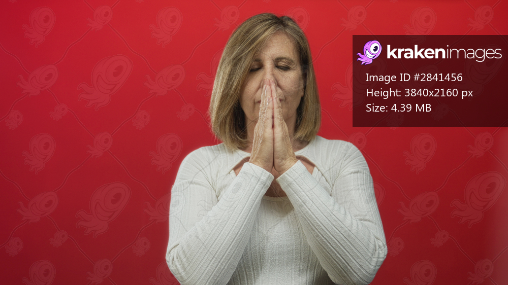Middle aged caucasian woman wearing a white sweater pressing palms together at nose in red studio during a quiet moment; serenity reflection.