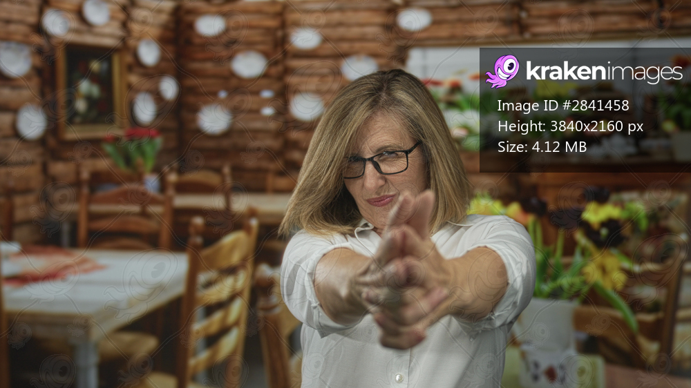 Middle aged caucasian woman wearing glasses and white blouse uses finger gun gesture outside a flower shop building; playfulness.