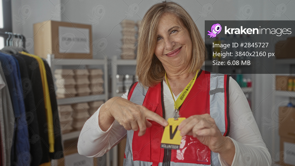 Middle-aged caucasian woman wearing red vest points finger to badge beside donation box in building; compassion support.