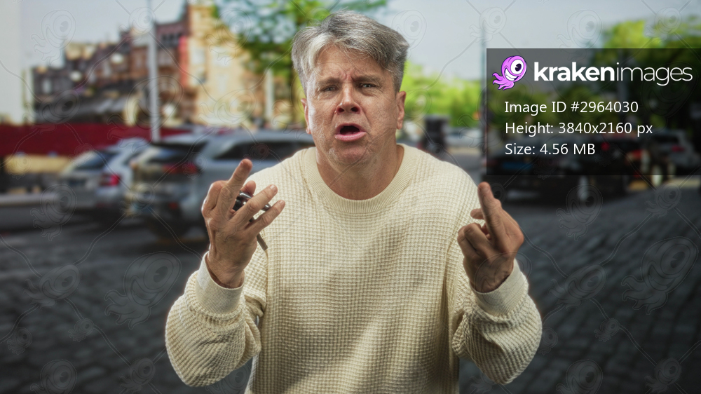 Middle aged grey haired man in cream sweater shows both middle fingers toward car on cobblestone street with buildings and trees visible; road rage anger. - Kraken Images