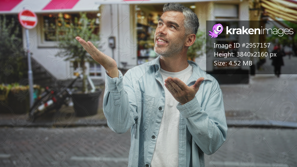 Middle aged grey haired man palms up presenting a storefront, bicycle and no entry sign on a cobbled street; cheerful welcome.