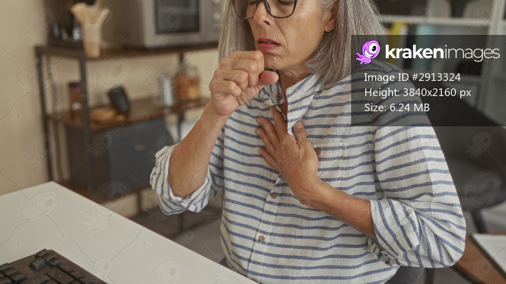 Middle aged grey haired woman coughing into fist and holding chest while seated at desk in office building; concern health.