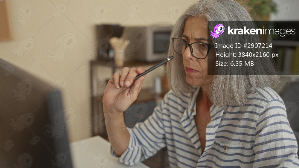 Middle aged grey haired woman with glasses holding pencil to lips at desk in office, studying a computer screen with furrowed brow; contemplation focus. - Kraken Images