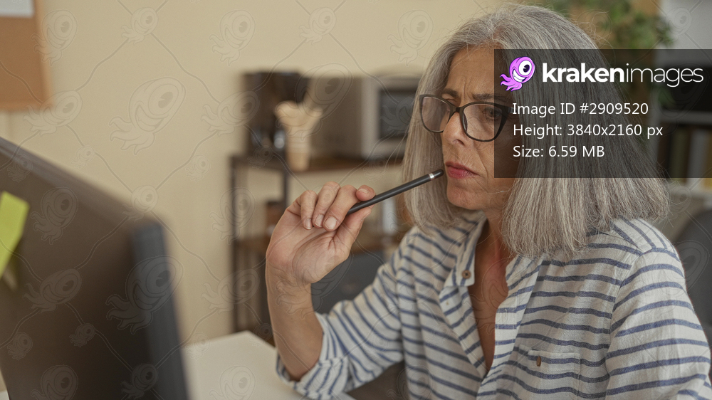 Middle aged grey haired woman with glasses holding pencil to lips at desk in office, studying a computer screen with furrowed brow; contemplation focus. - Kraken Images