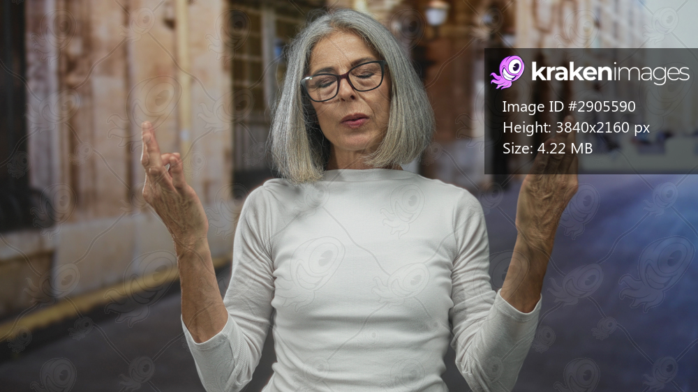 Middle aged grey haired woman with glasses and white top raises both hands palms forward on street in front of blurred stone facade; serene reflection. - Kraken Images