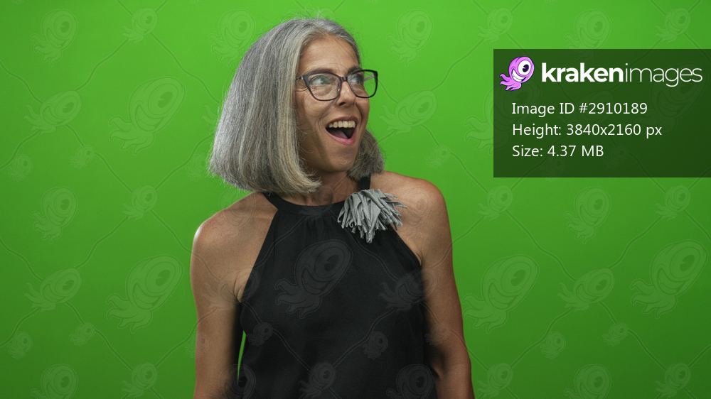 Middle aged grey haired woman with mouth open gasping while turning head in green studio; surprise curiosity.