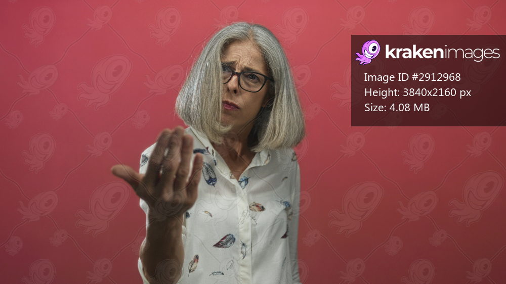 Middle aged grey haired woman pointing finger in a studio with pink backdrop; anger accusation demand.