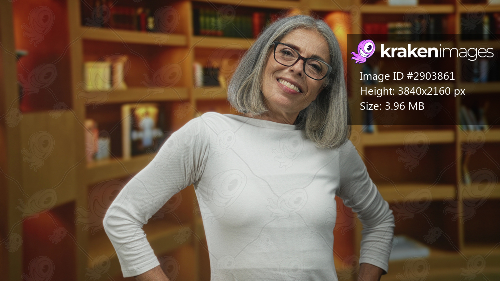 Middle aged grey haired woman smiling with hands on hips among books in a public library building wearing glasses and a white top; confidence wisdom.