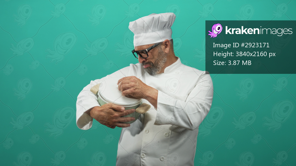Middle aged hispanic man chef holding a pot and tightening its lid in a teal studio wearing white uniform and hat; culinary focus.