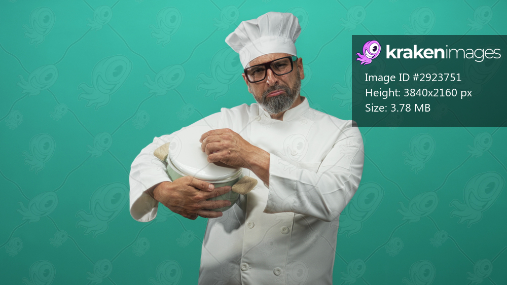 Middle aged hispanic man chef holding a pot and tightening its lid in a teal studio wearing white uniform and hat; culinary focus.