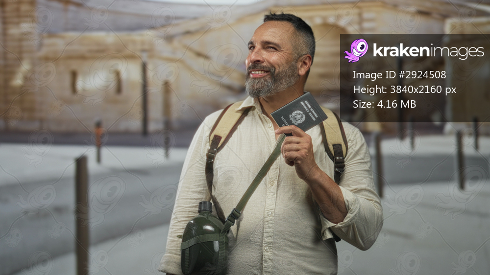 Middle aged hispanic man with gray beard holding passport and canteen, backpack straps visible on street near stone building; travel adventure joy.