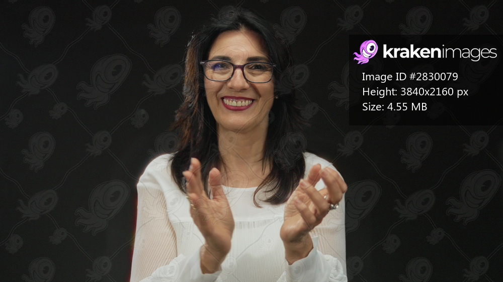 Middle-aged hispanic woman claps hands wearing white blouse in black studio; celebration joy encouragement.