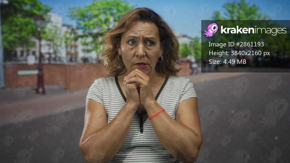 Middle aged hispanic woman with clasped hands near chest on urban street in warm daylight looking sideways; anxiety.