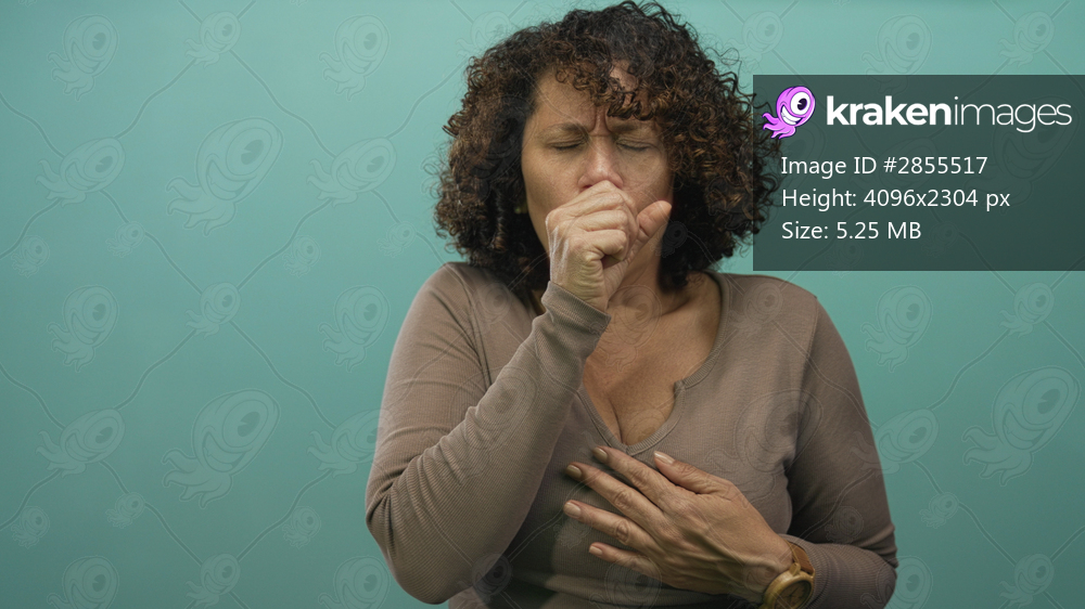 Middle aged hispanic woman coughing into fist while holding chest in studio teal backdrop; discomfort.