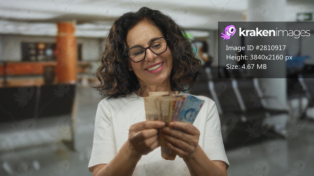 Middle-aged hispanic woman counting mexican pesos indoors at an airport terminal, expressing joy and financial preparedness for travel.