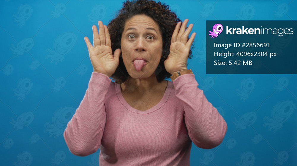 Middle aged hispanic woman covering face with hands in blue studio then uncovering while smiling and waving; joy playful gesture.