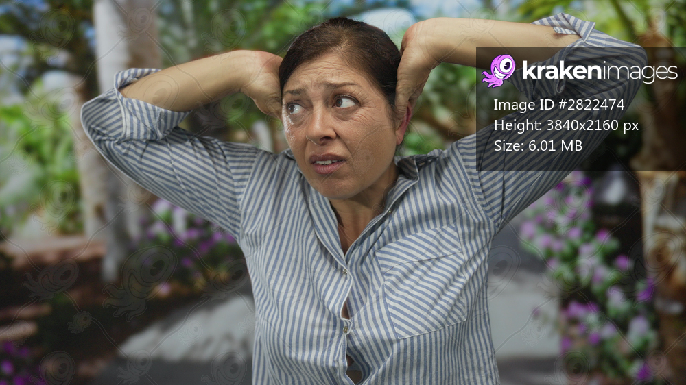 Middle aged hispanic woman covers ears with hands on sunlit green forest path; auditory discomfort.