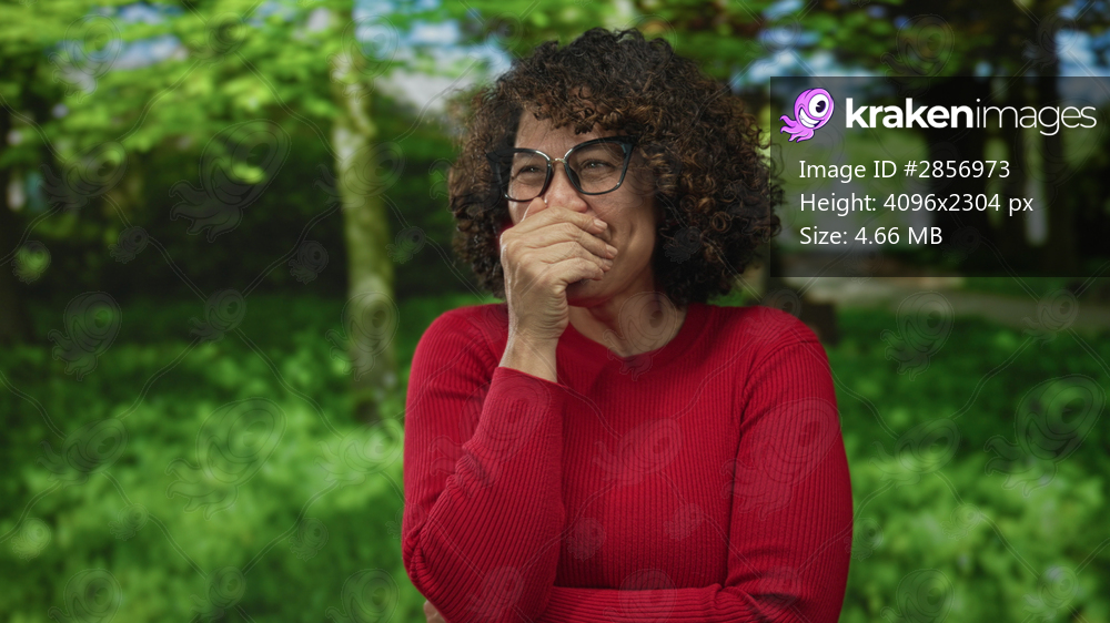 Middle aged hispanic woman covers mouth with hand while laughing in green forest; amusement happiness.