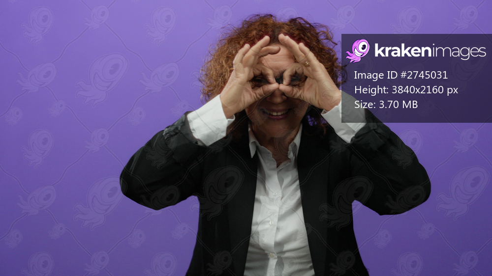 Middle-aged hispanic woman with curly brunette hair in a suit playfully making binoculars gesture with hands against a vivid purple background.