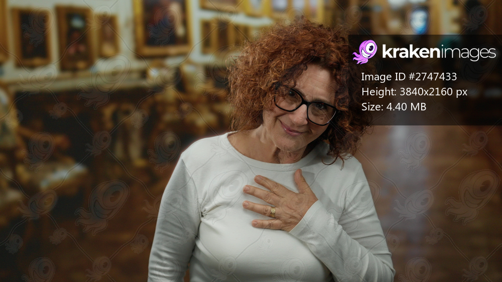 Middle-aged hispanic woman with curly brunette hair stands smiling in an art gallery, wearing glasses and a white shirt, surrounded by paintings in a warm indoor setting. - Kraken Images