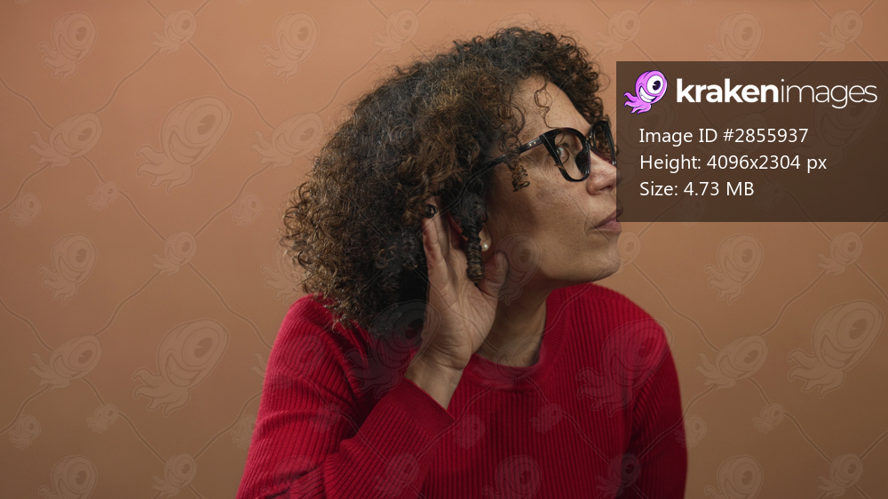 Middle aged hispanic woman with curly hair and glasses cupping ear against peach backdrop in studio; attentiveness.