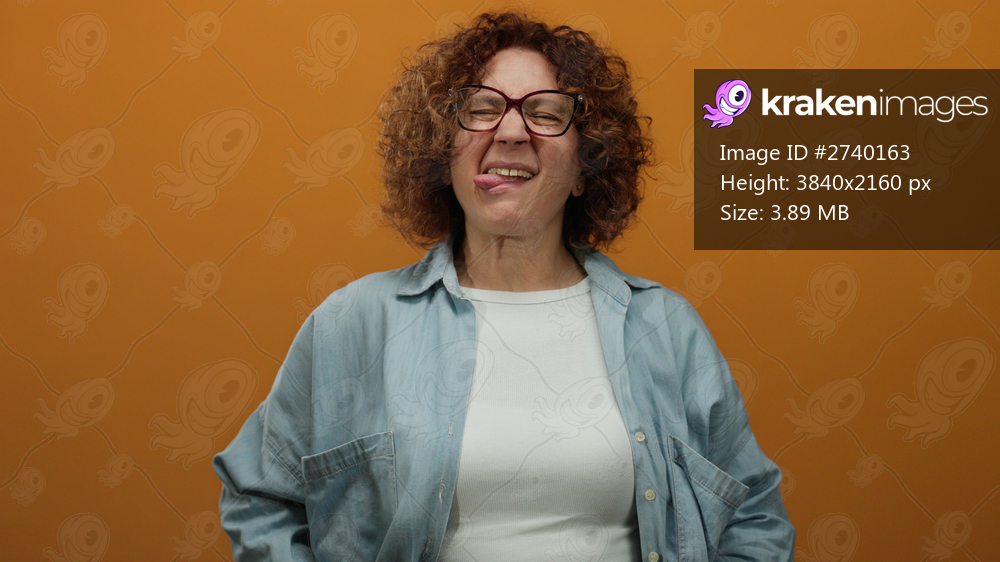 Middle-aged hispanic woman with curly hair and glasses making a silly face against a vibrant orange background, exuding playful and humorous vibes in a casual denim shirt. - Kraken Images