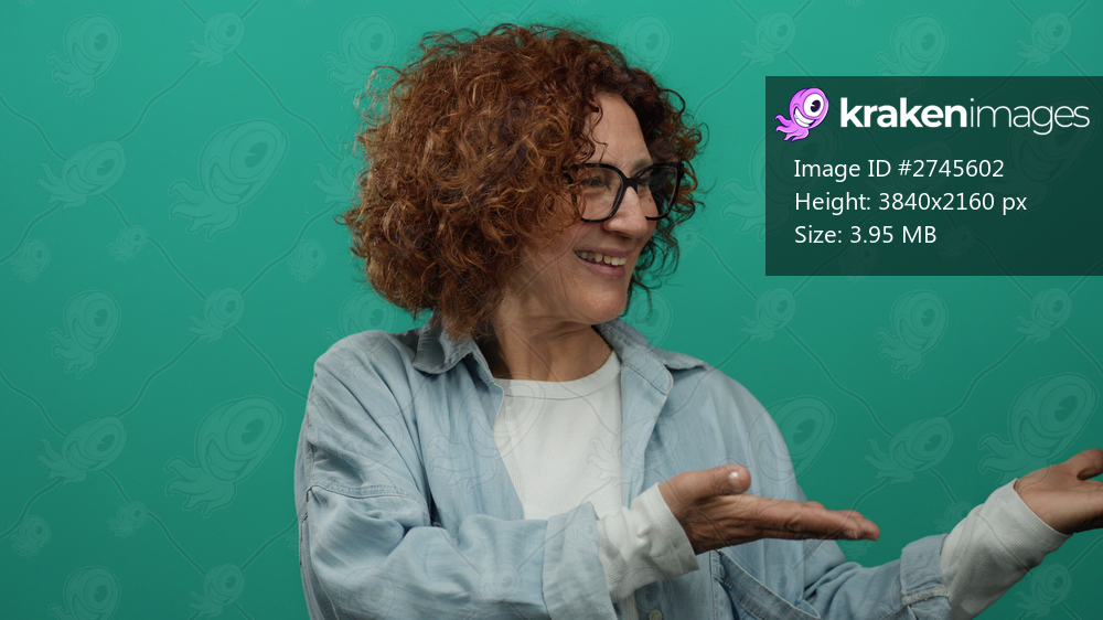 Middle-aged hispanic woman with curly hair smiling and gesturing with open hands against a vibrant green background, displaying a friendly mood.