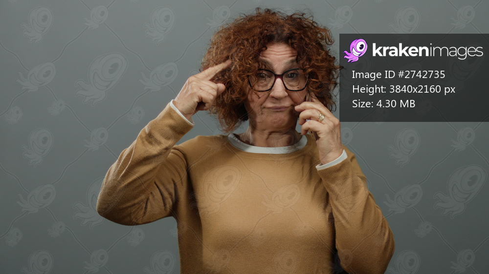 Middle-aged hispanic woman with curly hair talking on a cellphone, pointing to her head over an isolated grey background, wearing glasses and a brown sweater. - Kraken Images