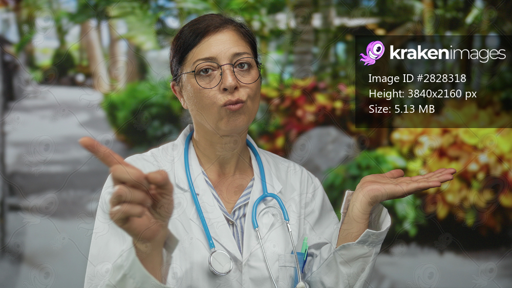 Middle aged hispanic woman doctor with blue stethoscope pointing finger and open palm in dense green forest; compassion.