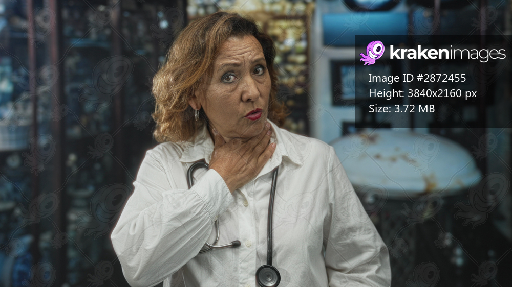 Middle aged hispanic woman doctor with stethoscope holding hand on throat in building; health concern.