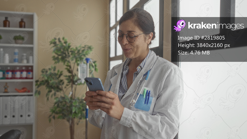 Middle aged hispanic woman doctor with stethoscope holding smartphone by sunlit window inside clinic building; serenity.
