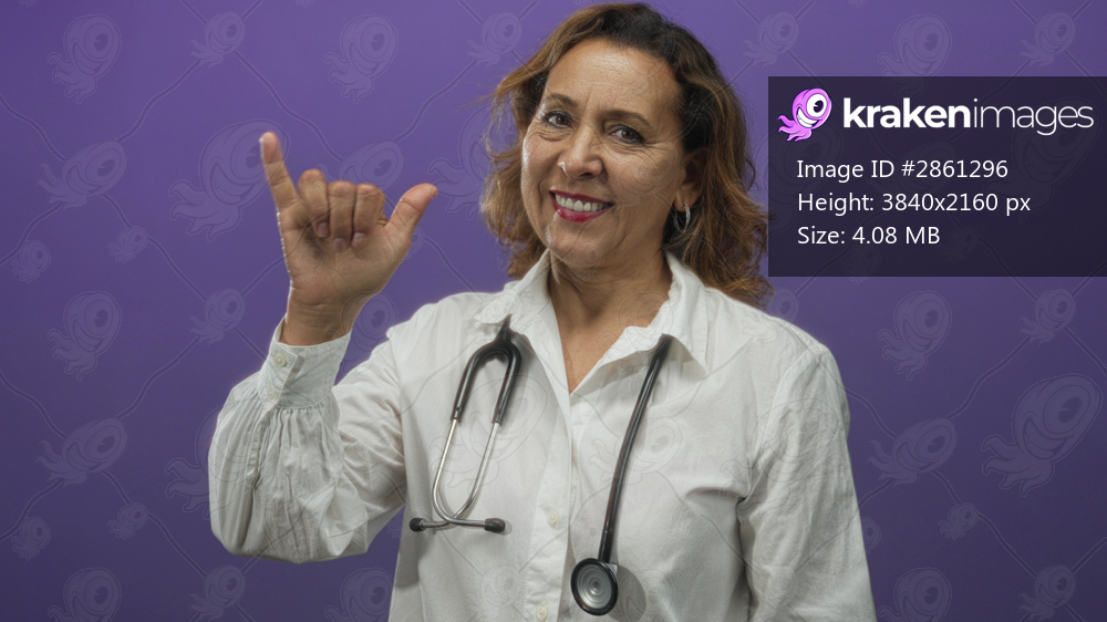 Middle aged hispanic woman doctor wearing a white shirt and stethoscope smiles and raises hand in purple studio; compassion.