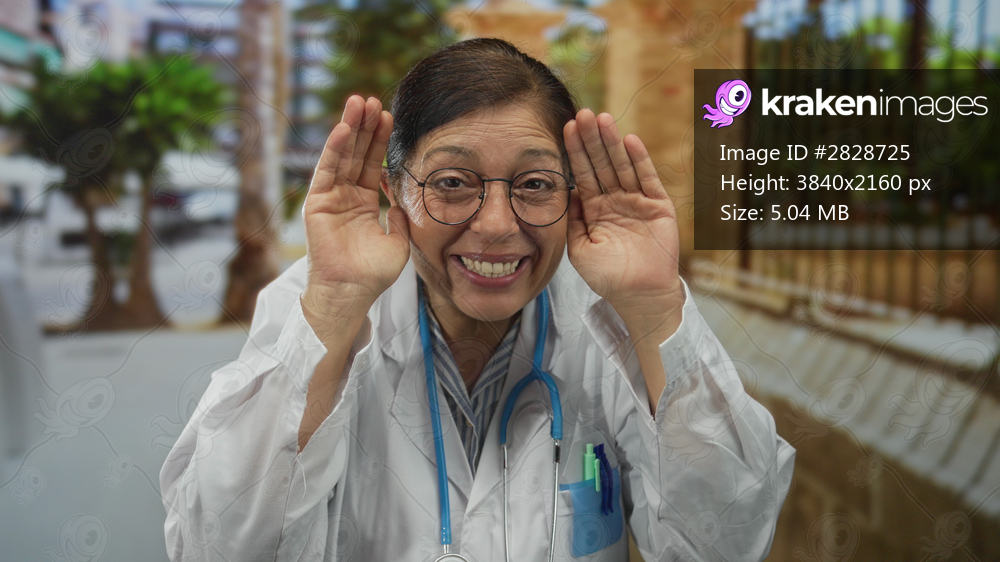 Middle aged hispanic woman doctor wearing stethoscope smiling frames her hands around face on street; joy.