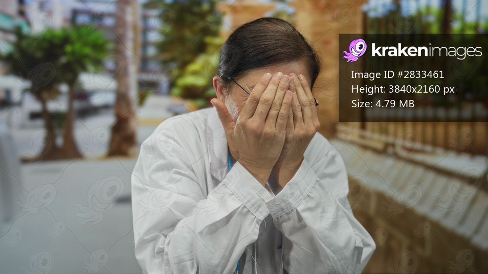 Middle aged hispanic woman doctor wearing stethoscope smiling frames her hands around face on street; joy.