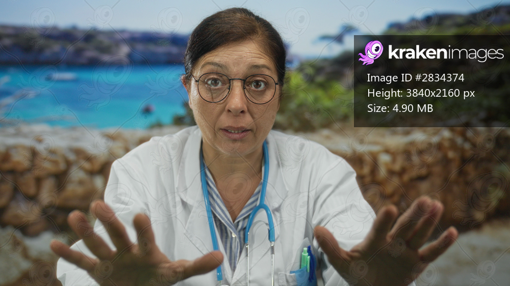 Middle aged hispanic woman doctor wearing white coat and stethoscope raises palms out at seaside promenade; reassurance.