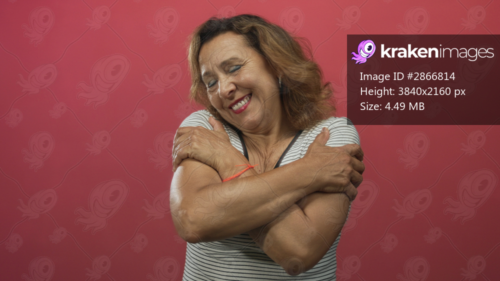 Middle aged hispanic woman extends arms forward and smiles in studio with red background; invitation warmth.