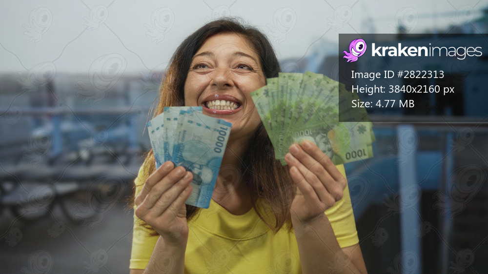 Middle aged hispanic woman fans blue and green chilean pesos on sunlit cruise ship deck; happiness wealth.