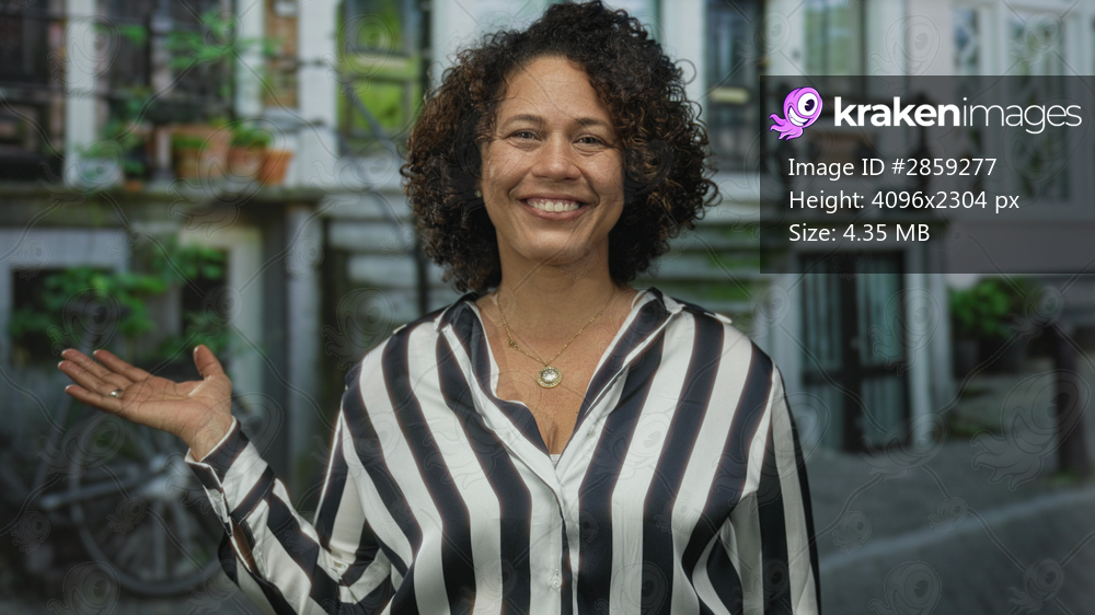Middle aged hispanic woman gestures open palm at sunlit residential building entrance; hospitality joy.