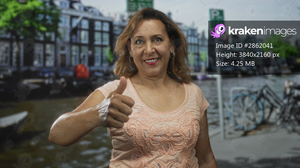 Middle aged hispanic woman gives double thumbs up gesture on street; confidence encouragement optimism.