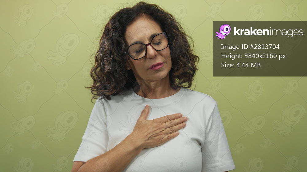 Middle aged hispanic woman with glasses in white shirt meditating against isolated yellow background showing calm and self reflection