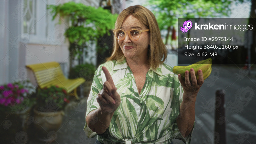 Middle aged hispanic woman with glasses points finger and holds a bunch of bananas on a street bench with potted plants and a yellow bench; cheerful confidence. - Kraken Images