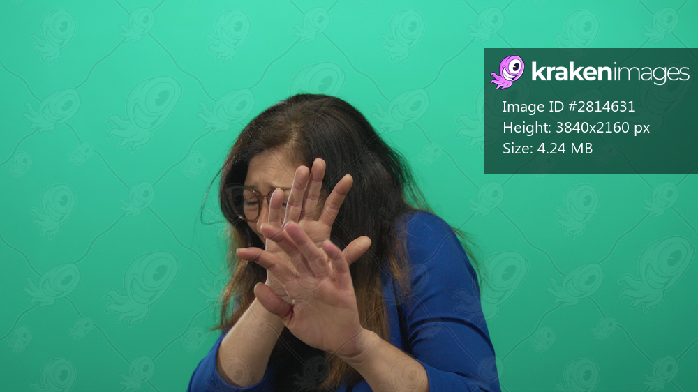 Middle-aged hispanic woman grimaces with hands raised to face in a green studio wearing a blue jacket; disgust.