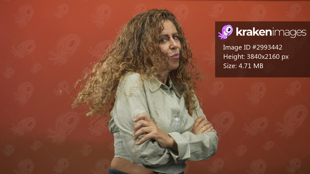 Middle aged hispanic woman with hair whipping and arms crossed in studio against orange wall; defiance.