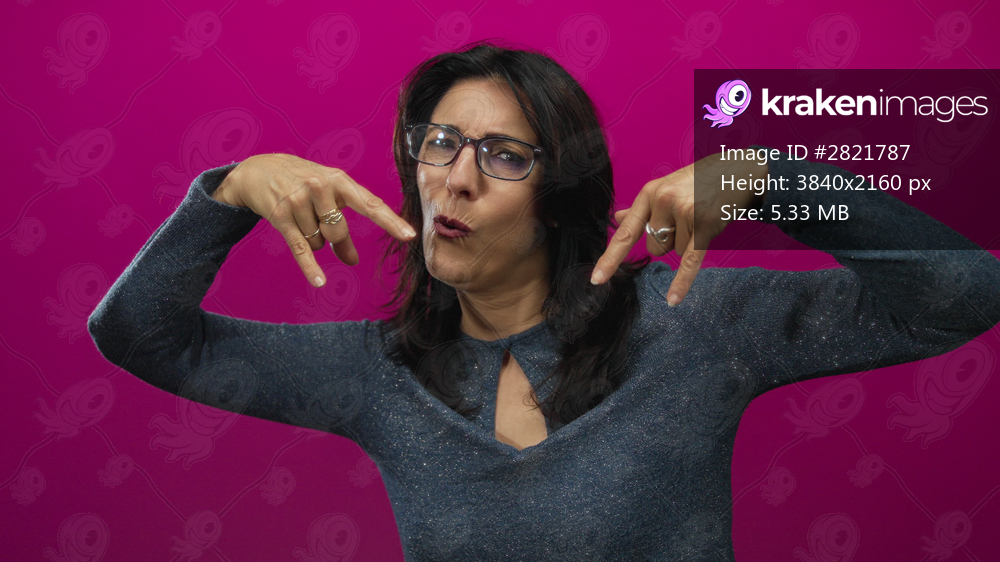 Middle aged hispanic woman hands form rock horns gesture while smiling against magenta wall in studio; rock metal fun.