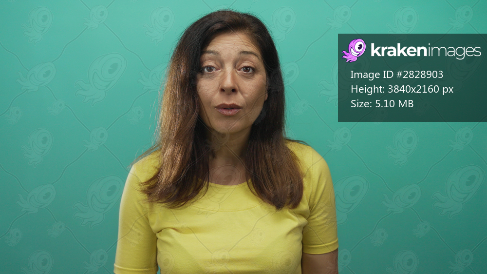 Middle aged hispanic woman with hands on head in studio environment with teal background and yellow shirt; surprise.