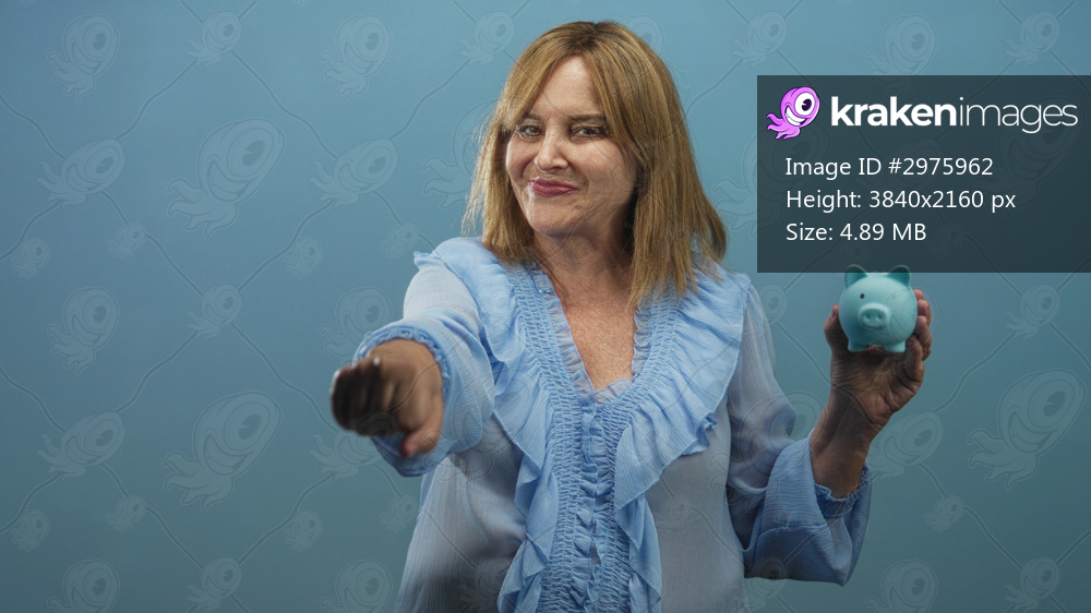 Middle aged hispanic woman holding blue piggy bank and punching forward with fist in studio; financial savings empowerment.